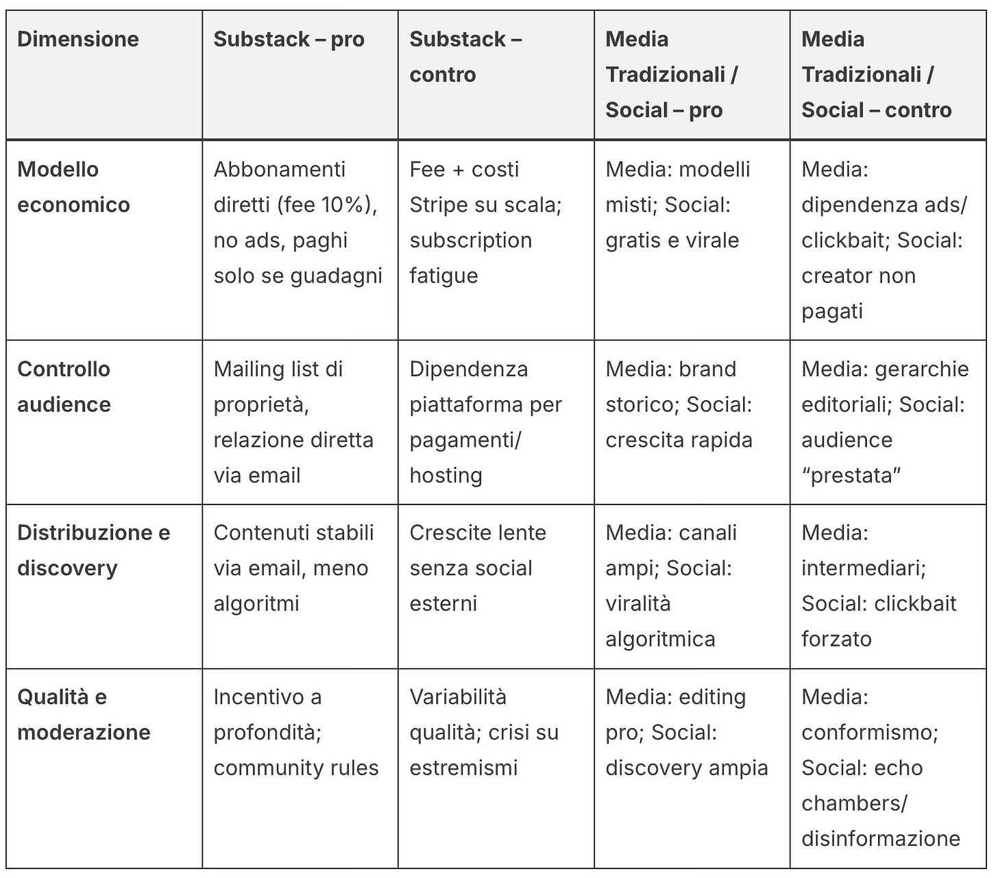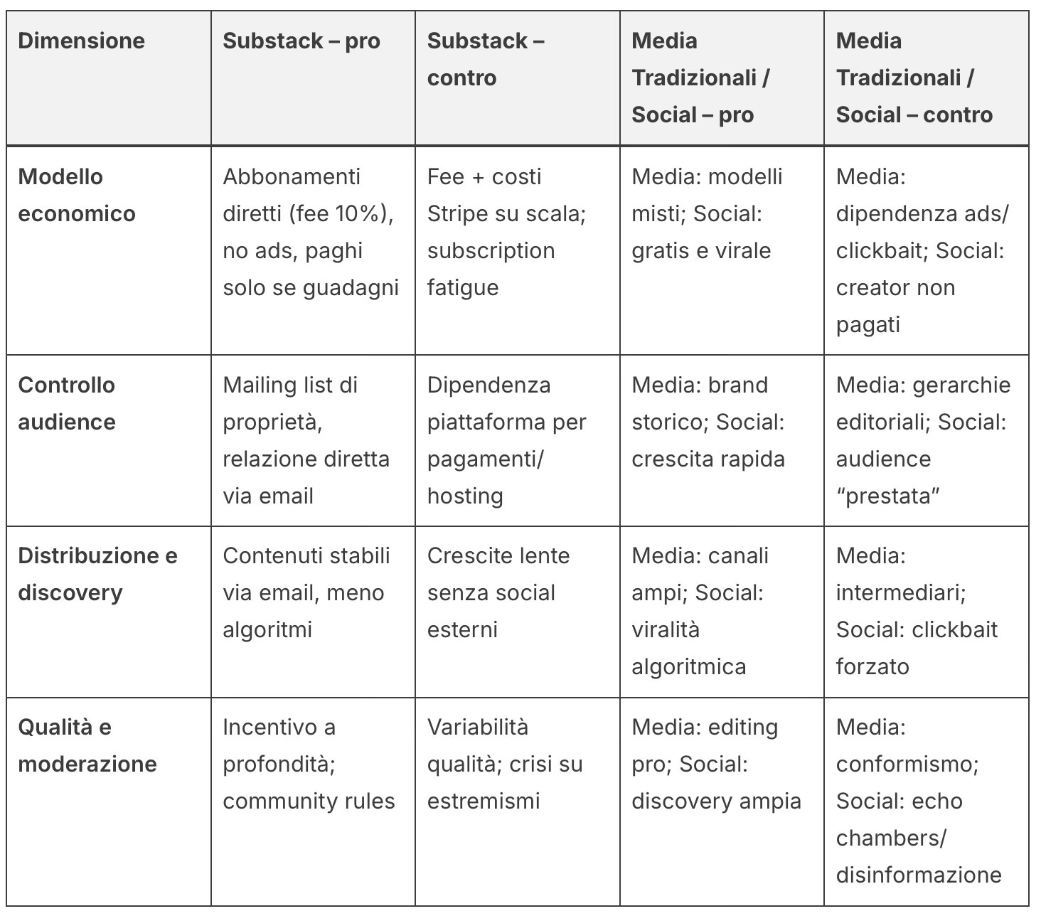 Substack rappresenta una risposta concreta alla crisi dei social network generalisti. Mentre Facebook invecchia e X-Twitter implode, nascono piattaforme costruite attorno a comunità verticali disposte a pagare per contenuti specializzati. Il livestreaming, i documentari originali e le serie prodotte specificamente per la piattaforma dimostrano che questo approccio funziona anche con formati complessi e costosi.