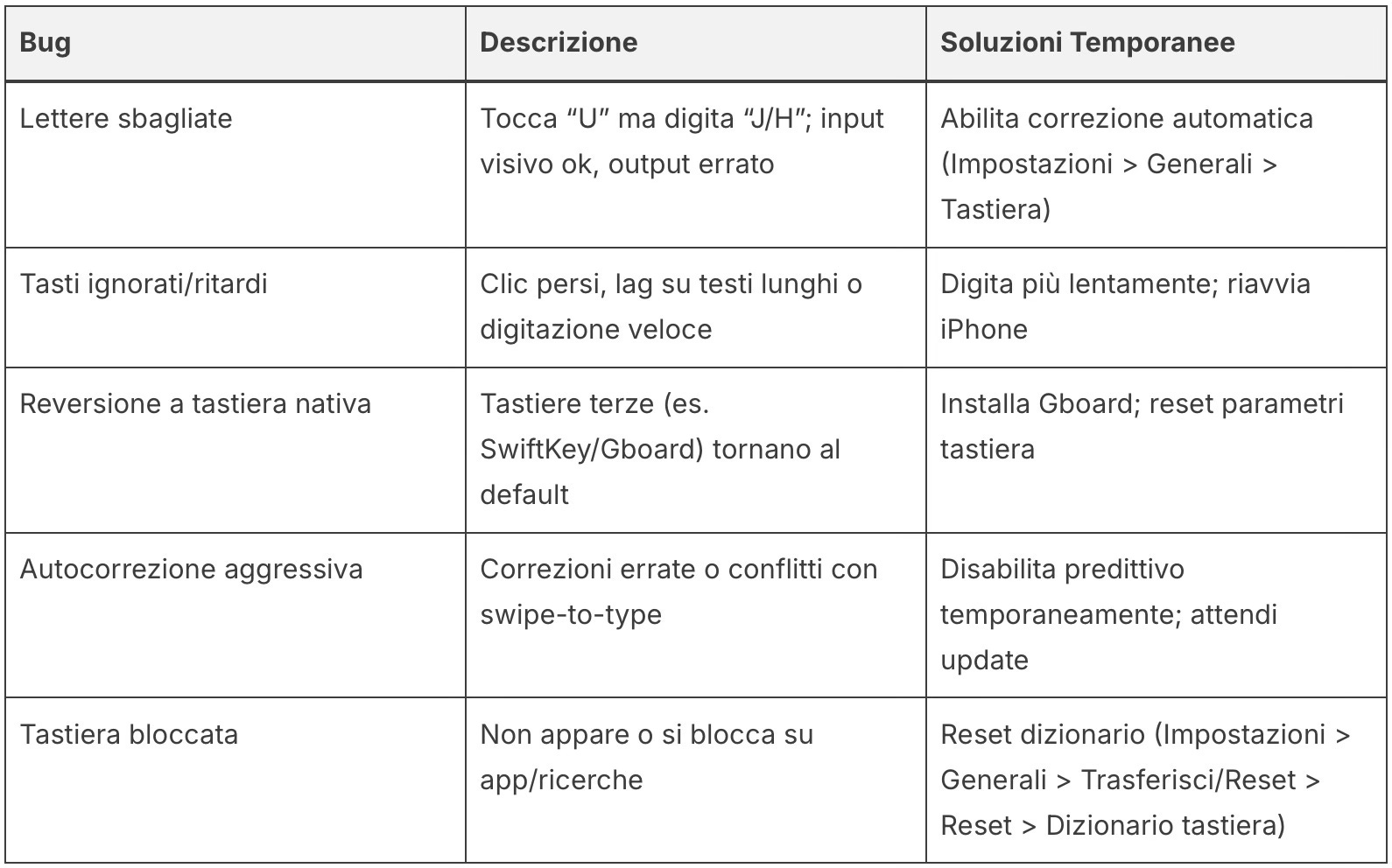 Le contromisure disponibili sono temporanee e parzialmente efficaci. Abilitare la correzione automatica nelle impostazioni generali attenua il problema senza eliminarlo. Passare a una tastiera di terze parti come Gboard e rallentare deliberatamente la velocità di digitazione riduce la frequenza degli errori, ma richiede un adattamento che molti utenti trovano insostenibile nel lungo periodo. Un riavvio del dispositivo porta qualche miglioramento transitorio. Apple non ha ancora rilasciato una correzione ufficiale.